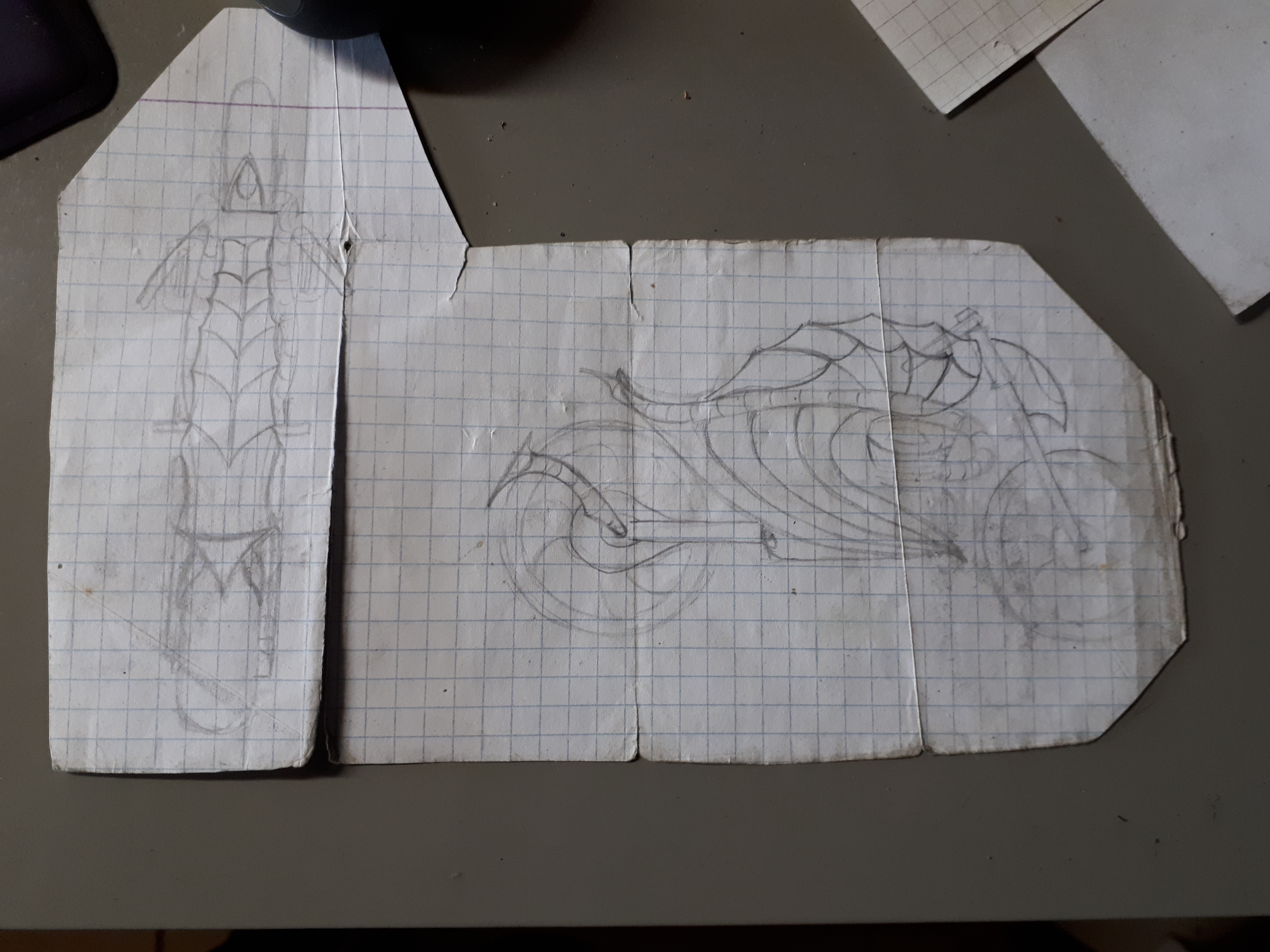 This was the first outline I drew, drafted with a pencil on a page I had torn off my daughter’s notebook. At that time I didn’t know yet what I would use to build this monster, but soon after I worked it out.