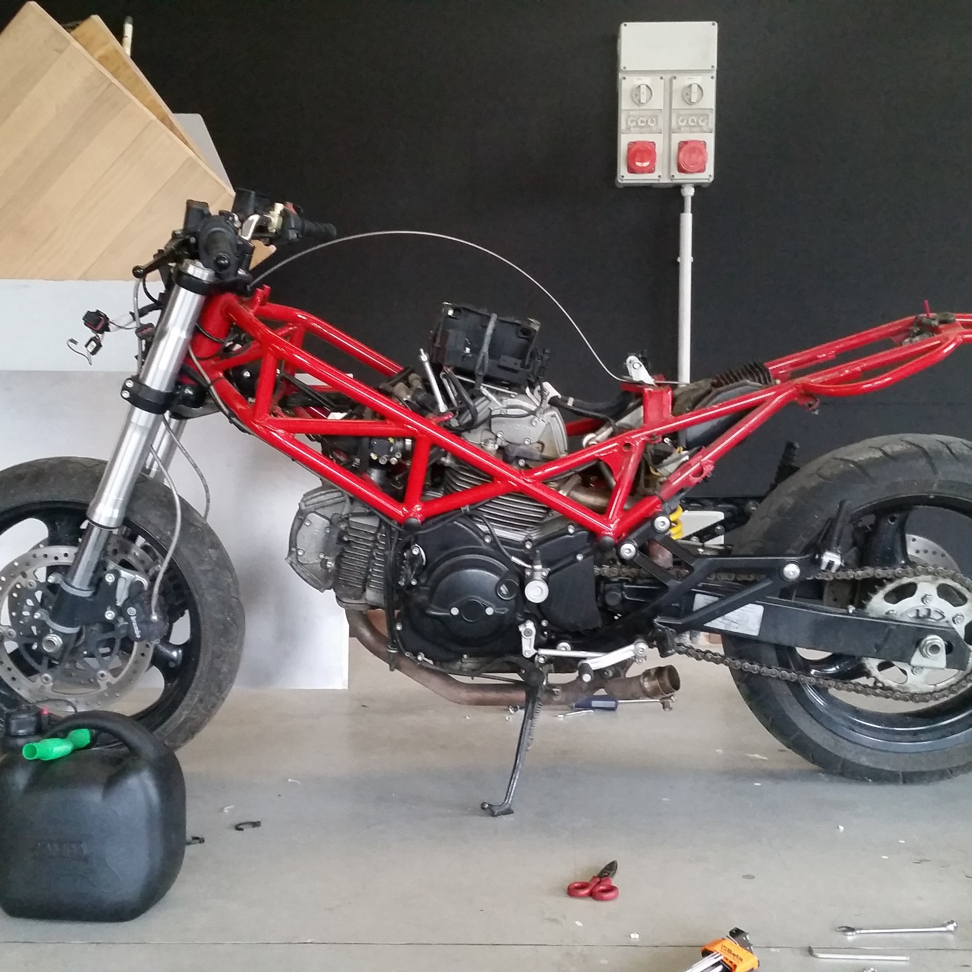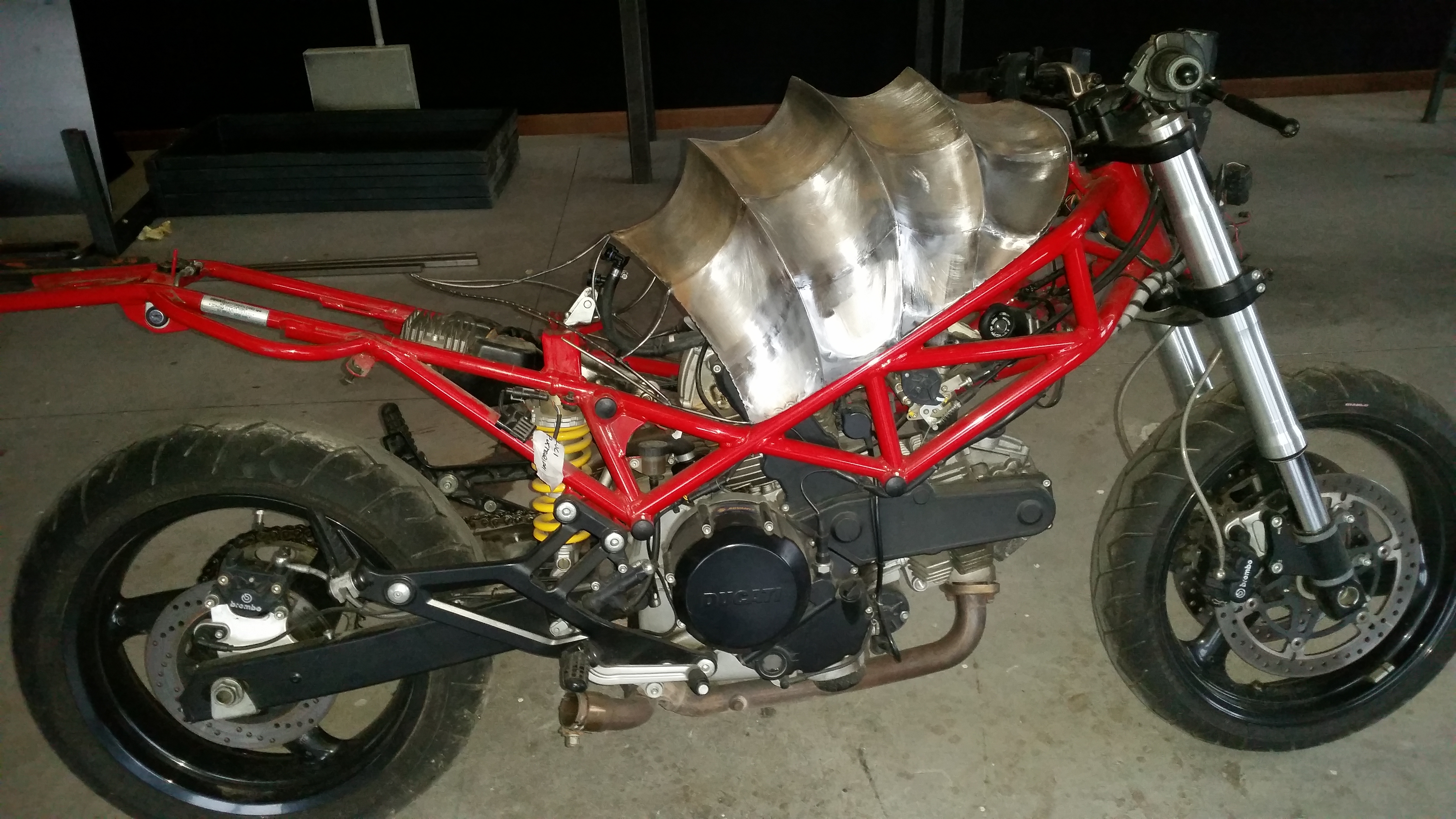 Una volta stabilita la base, iniziai a “sventrare” la moto, l’intento era quello di creare una forma completamente materica, portare tutto al nudo metallo, eliminando tutto il superfluo e sopratutto la plastica…