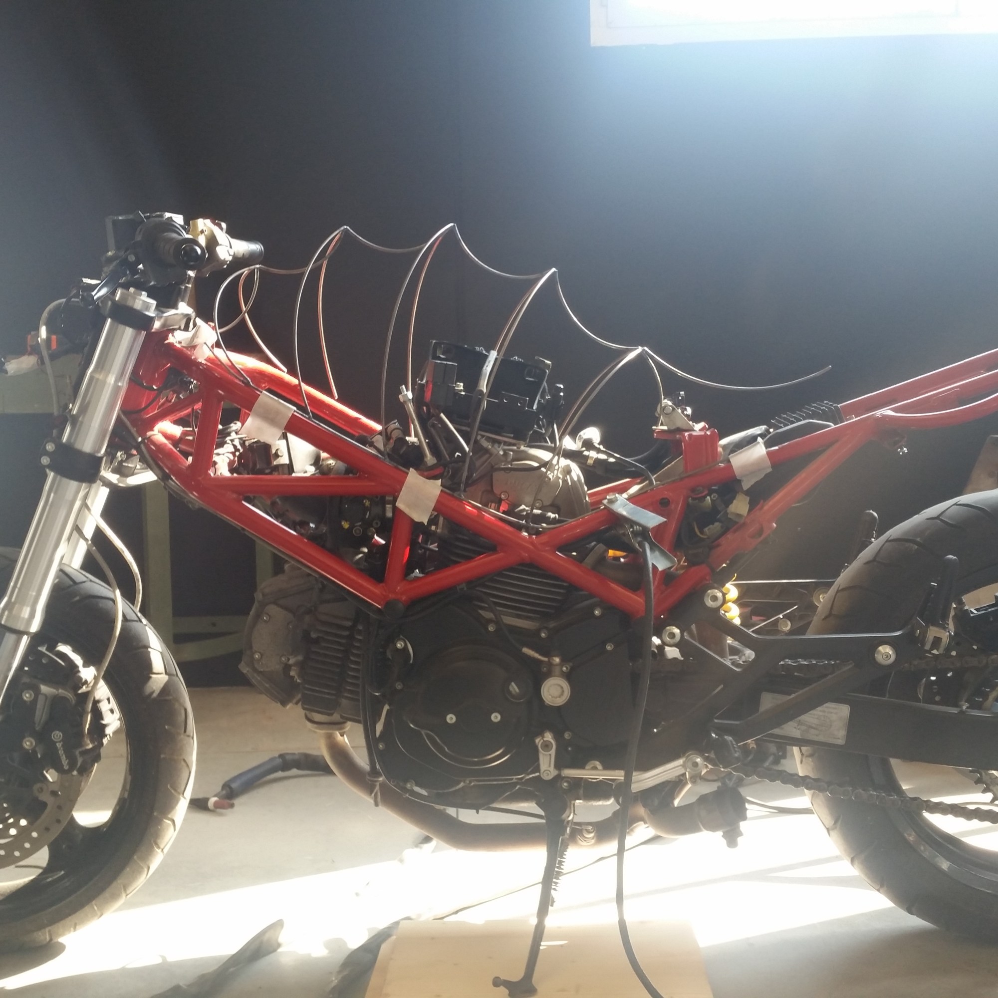 With the same technique I started building the fore fender and the headlight, but the first event I wanted to take part into was fast approaching: “Rombo di Tuono” was opening in Brescia. I had another bike ready for the exhibition, however despite all criticism and the fact that it wasn’t yet half way done, I decided to bring Apophis with me and left it in the far away corner of the stand, wrapped up in a wire mesh to hide it somehow. That was the best decision I could make, who would have ever said?