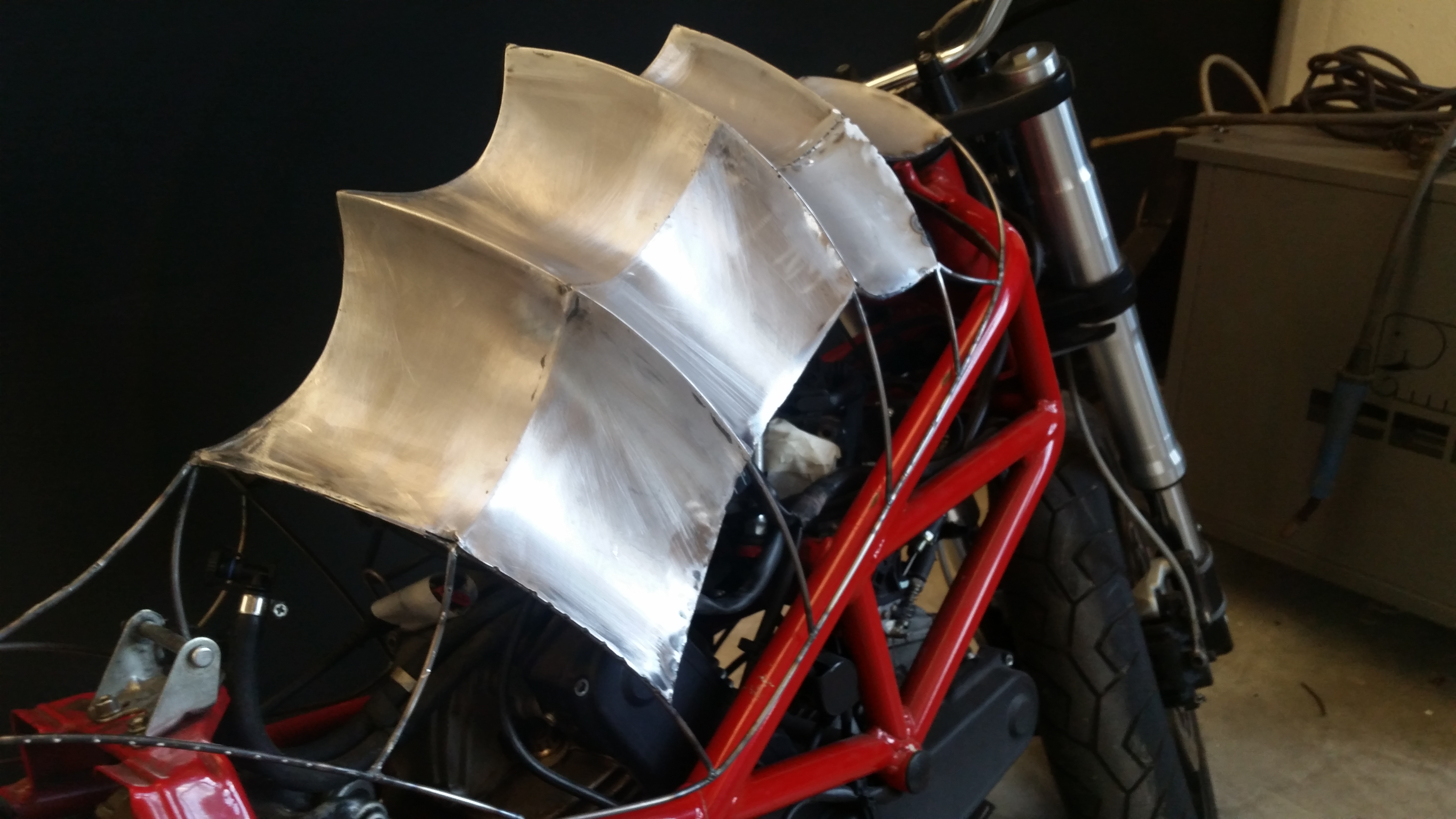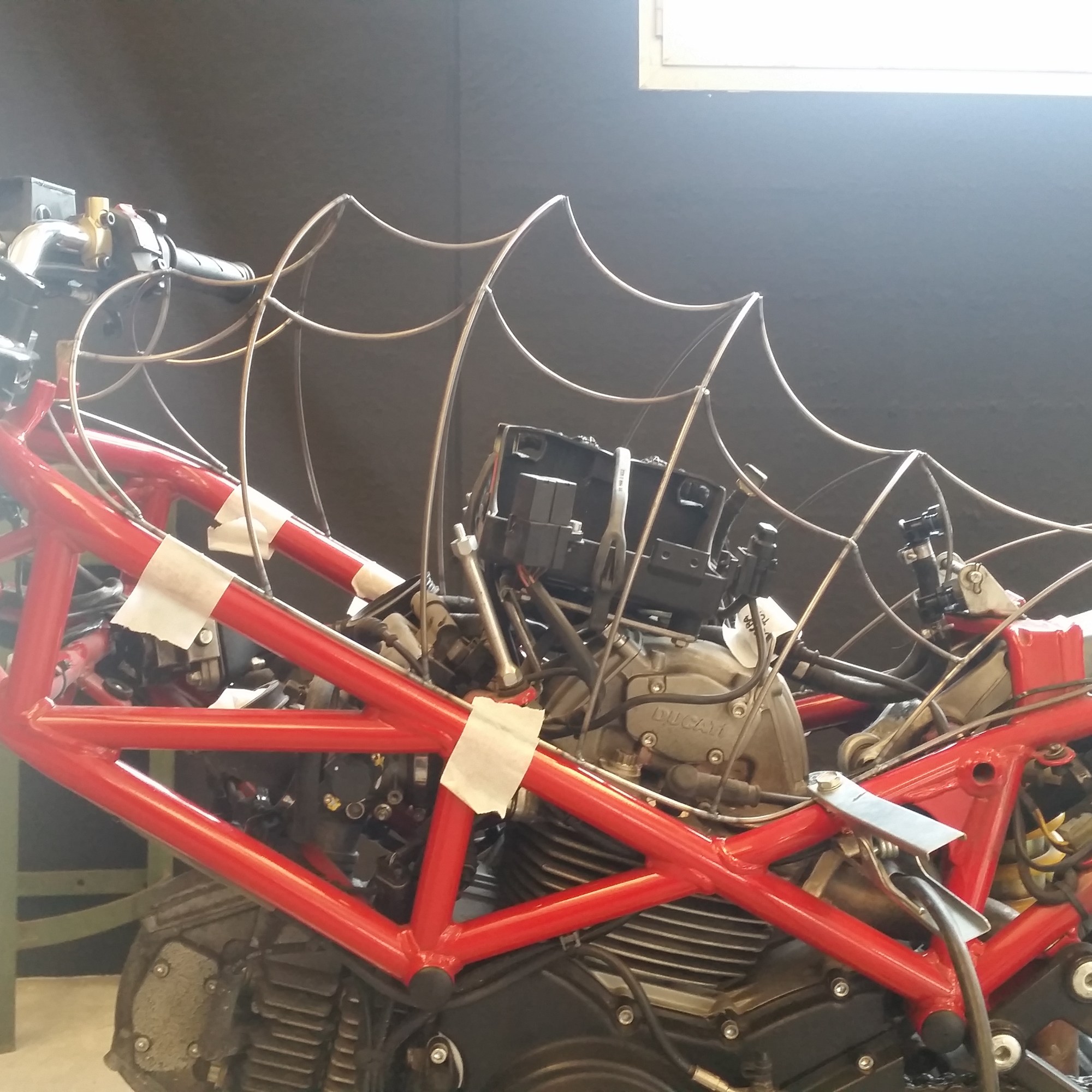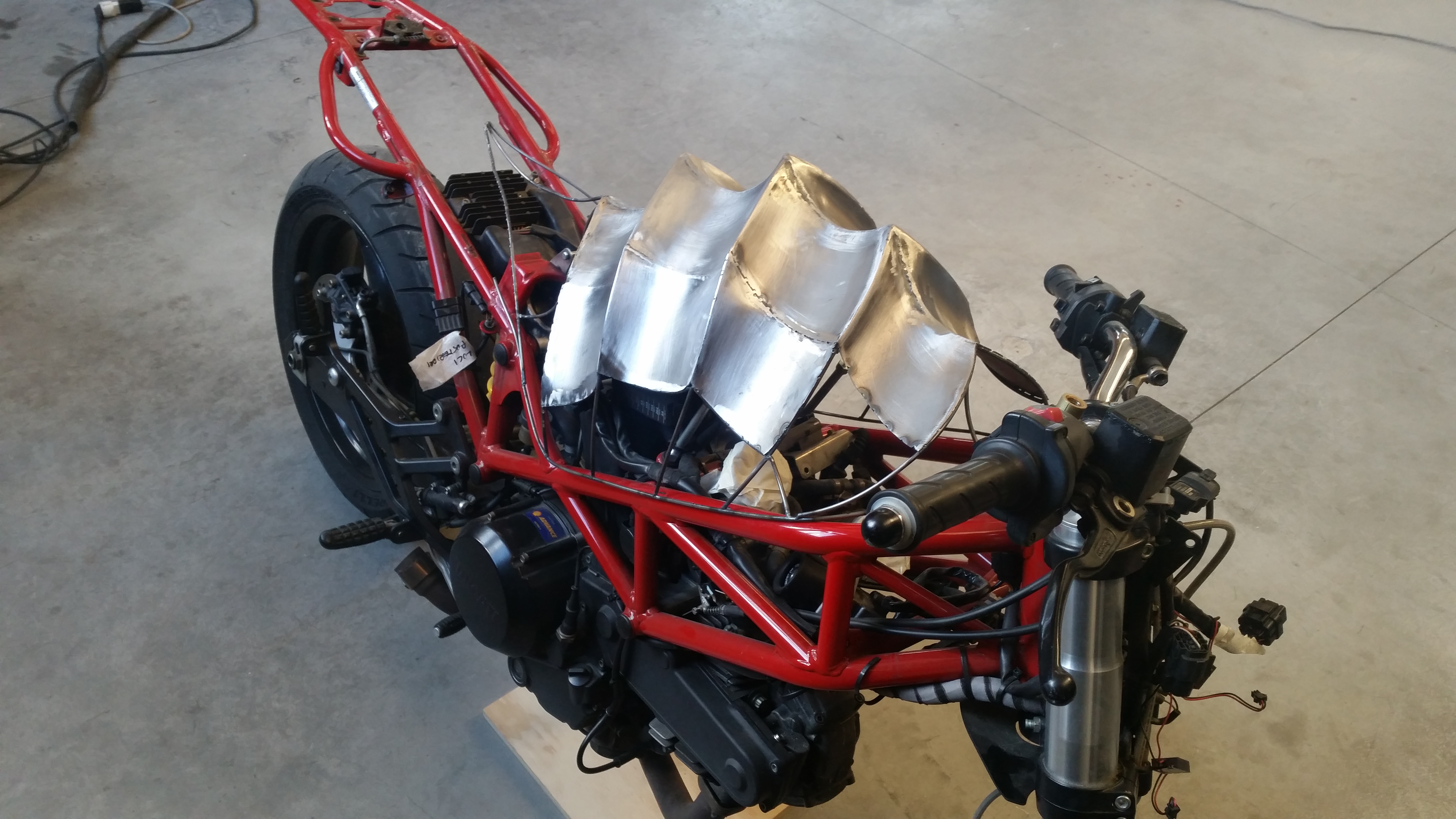 Con la stessa tecnica iniziai a costruire anche il parafango anteriore e il faro, ma il primo evento a cui avrei partecipato si stava avvicinando. A Brescia stava iniziando Rombo di tuono e avendo deciso ti portare un’altra moto in esposizione, tra mille critiche decisi che, nonostante Apophis non fosse nemmeno a metà dell’opera, dovevo portare anche lei… decisi di lasciarla sul fondo dello stand avvolta da una rete metallica un po’ per “nasconderla”. Chi avrebbe mai detto che avrei fatto la scelta più giusta che potevo fare?